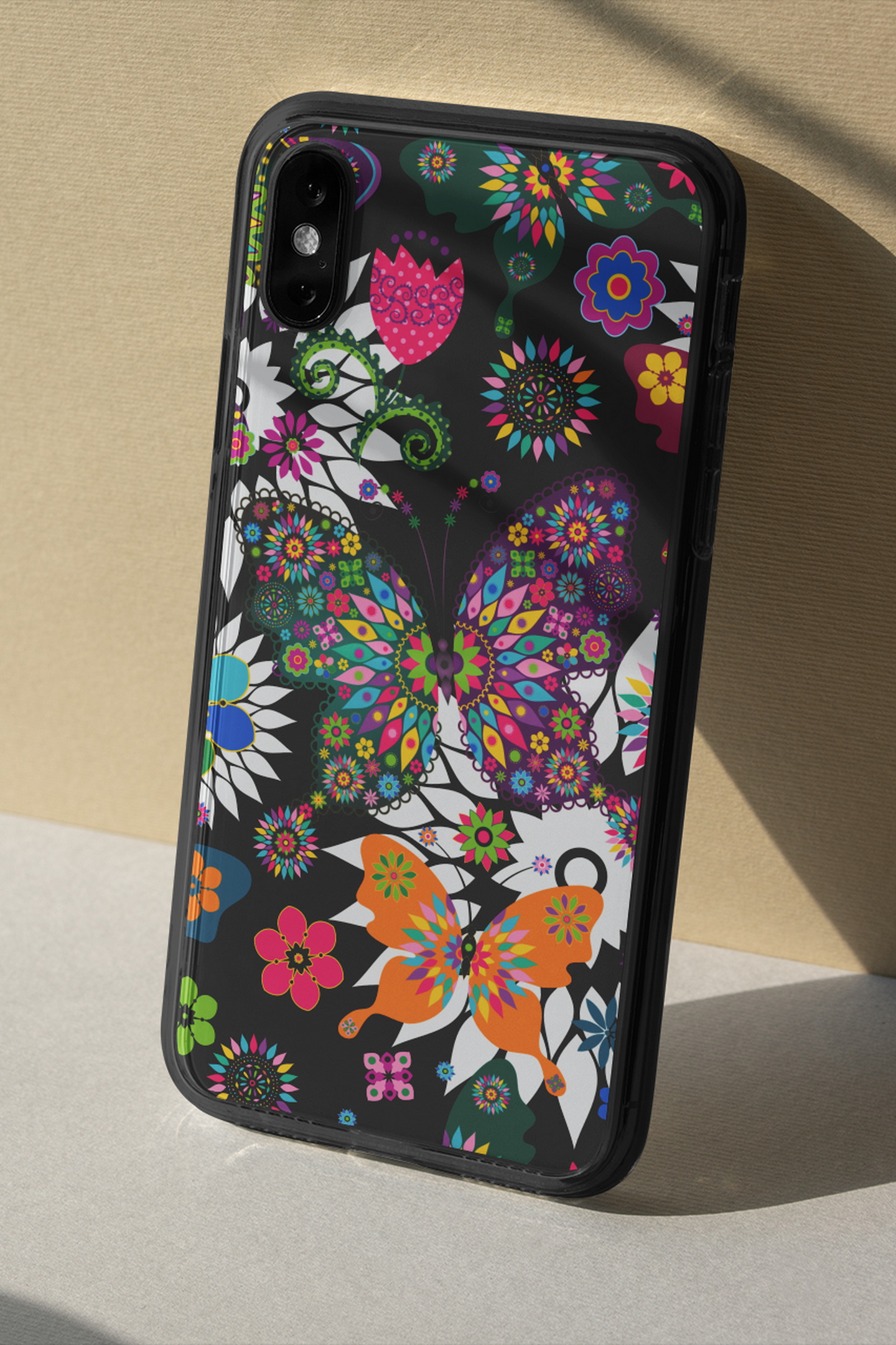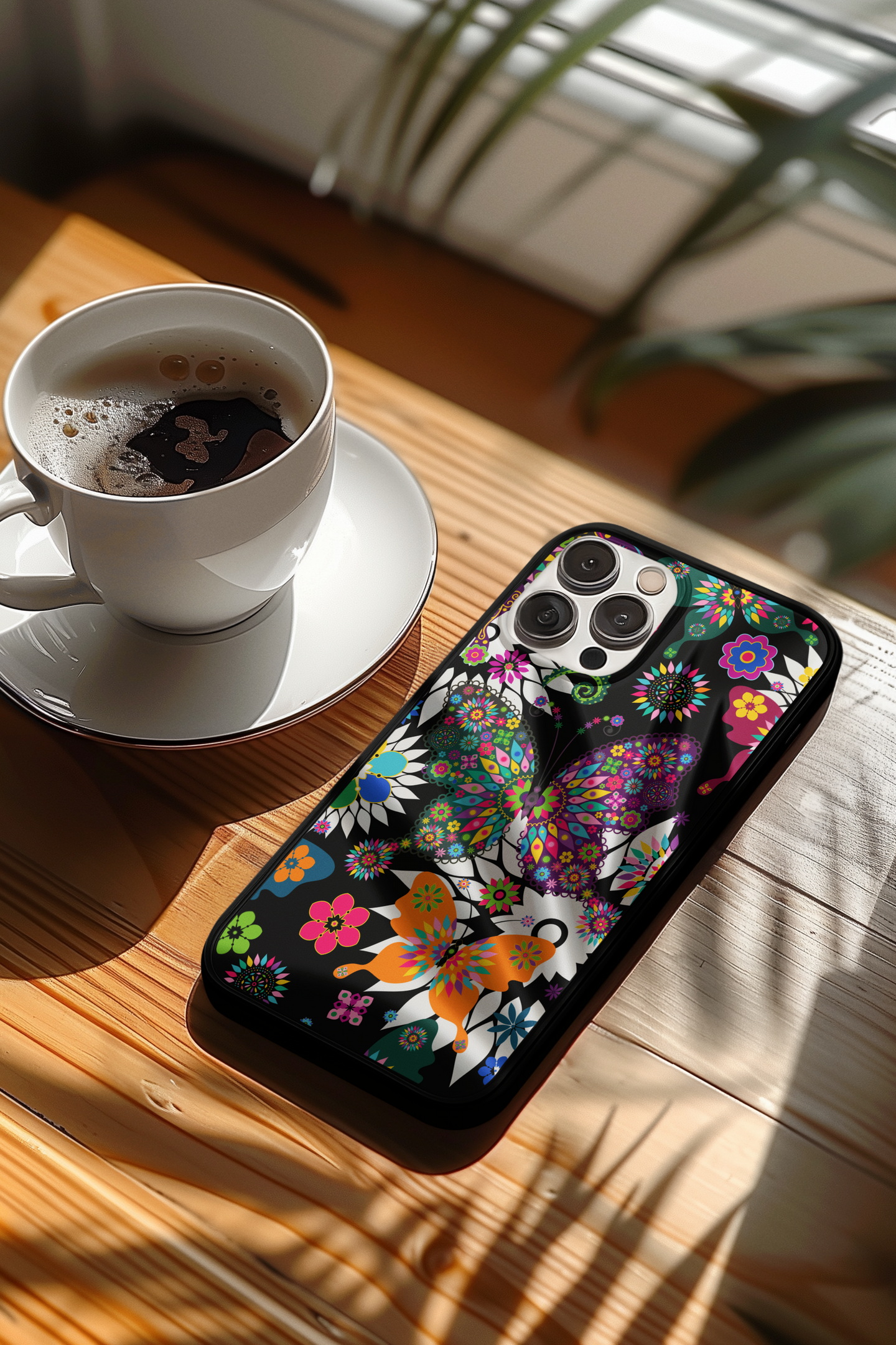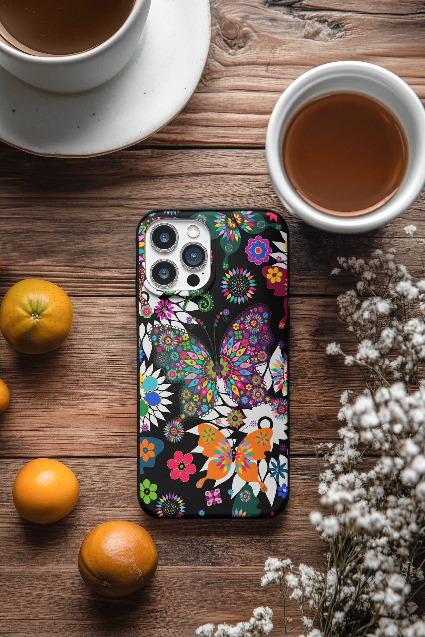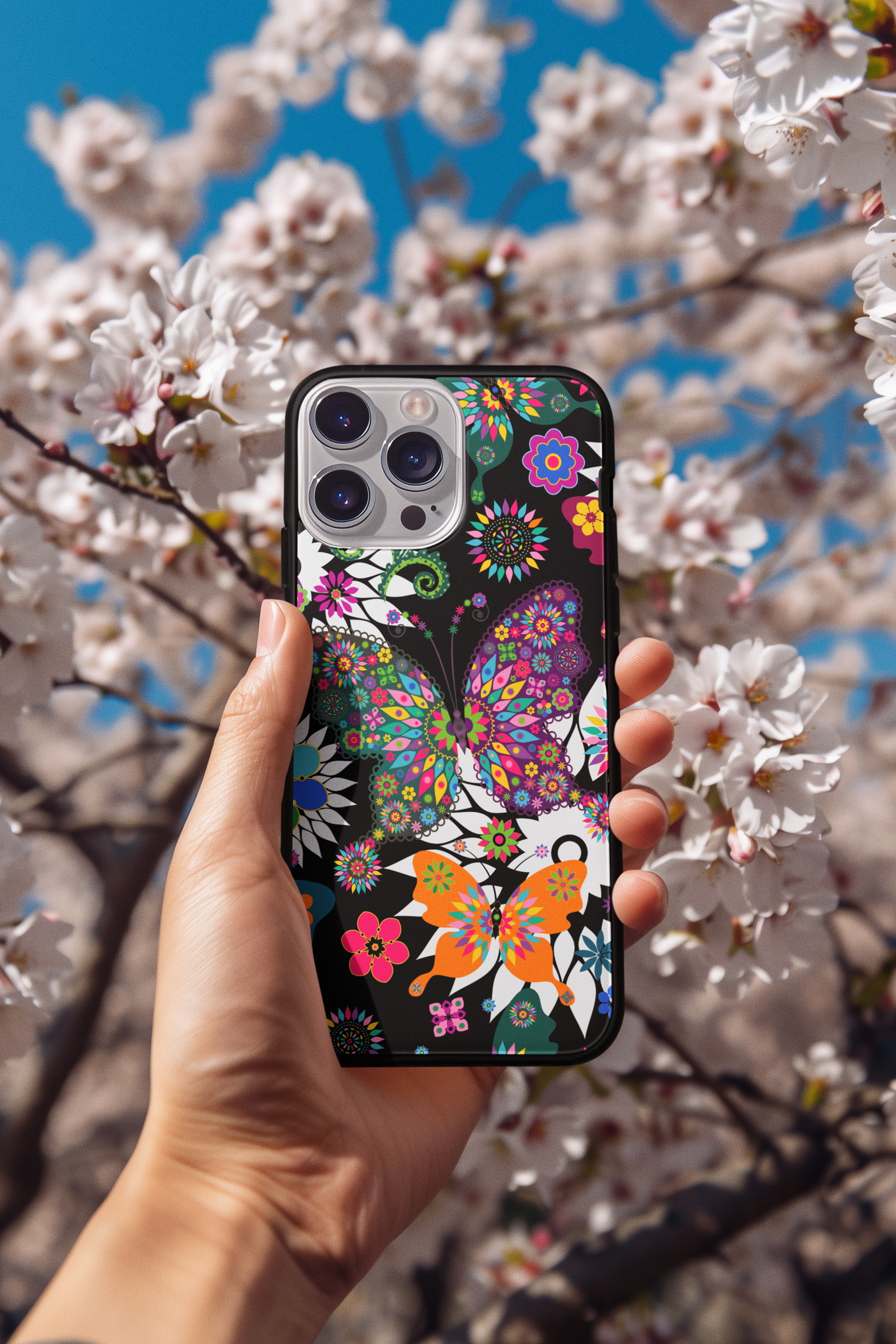 Vynikající ochranný obal pro mobilní telefony Apple iPhone, Samsung Galaxy, Google Pixel a Motorola Edge. Obrázkový motiv květinové louky s motýly na černém podkladu.