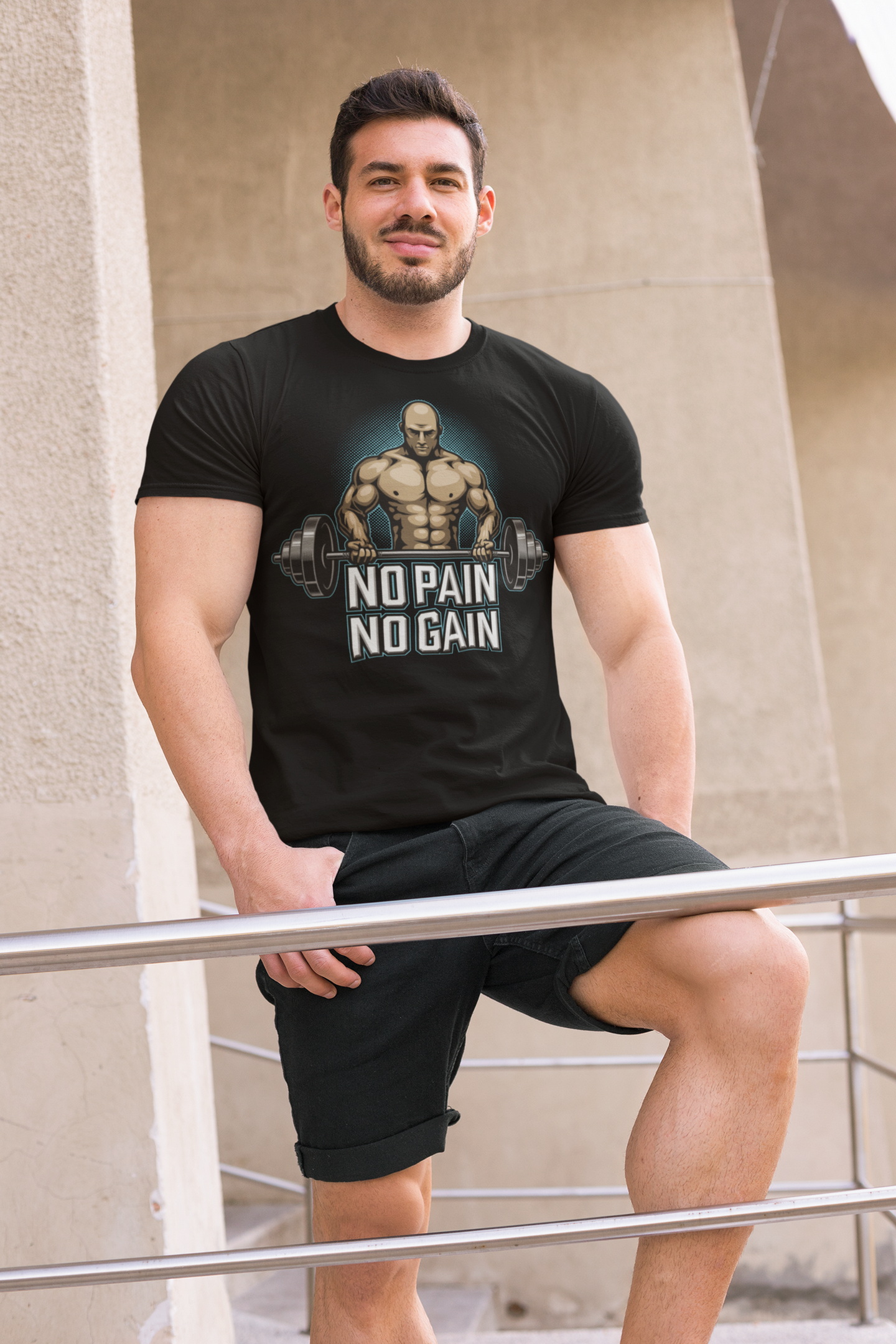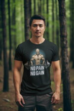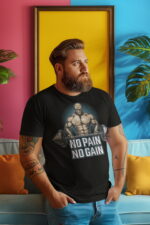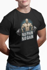 Pánské bavlněné tričko s potiskem, příjemné na nošení.  Motivem potisku je základní poučka pro všechny kulturisty a pěstitele svalové hmoty – „Žádná bolest, žádný zisk“ aneb „Není svalů bez bolesti“. Kvalitní materiál a prvotřídní digitální potisk.